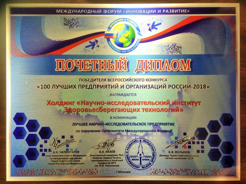 о включении Холдинга ООО «НИИ Здоровьесберегающих технологий» и Ярославского НИИ ЗСТ в число победителей конкурса «100 лучших предприятий и организаций России – 2018» в номинации «Лучшее научно-исследовательское предприятие».
